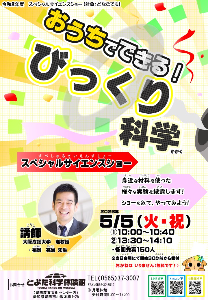 身近な材料を使った様々な実験を披露します!ショーを見て、やってみよう!